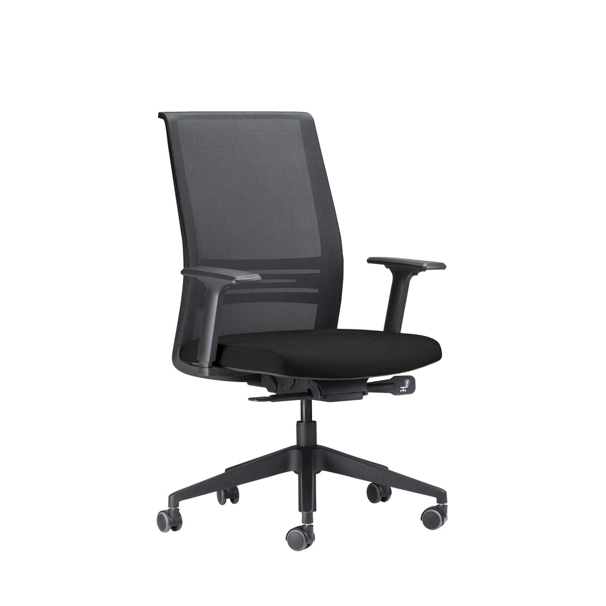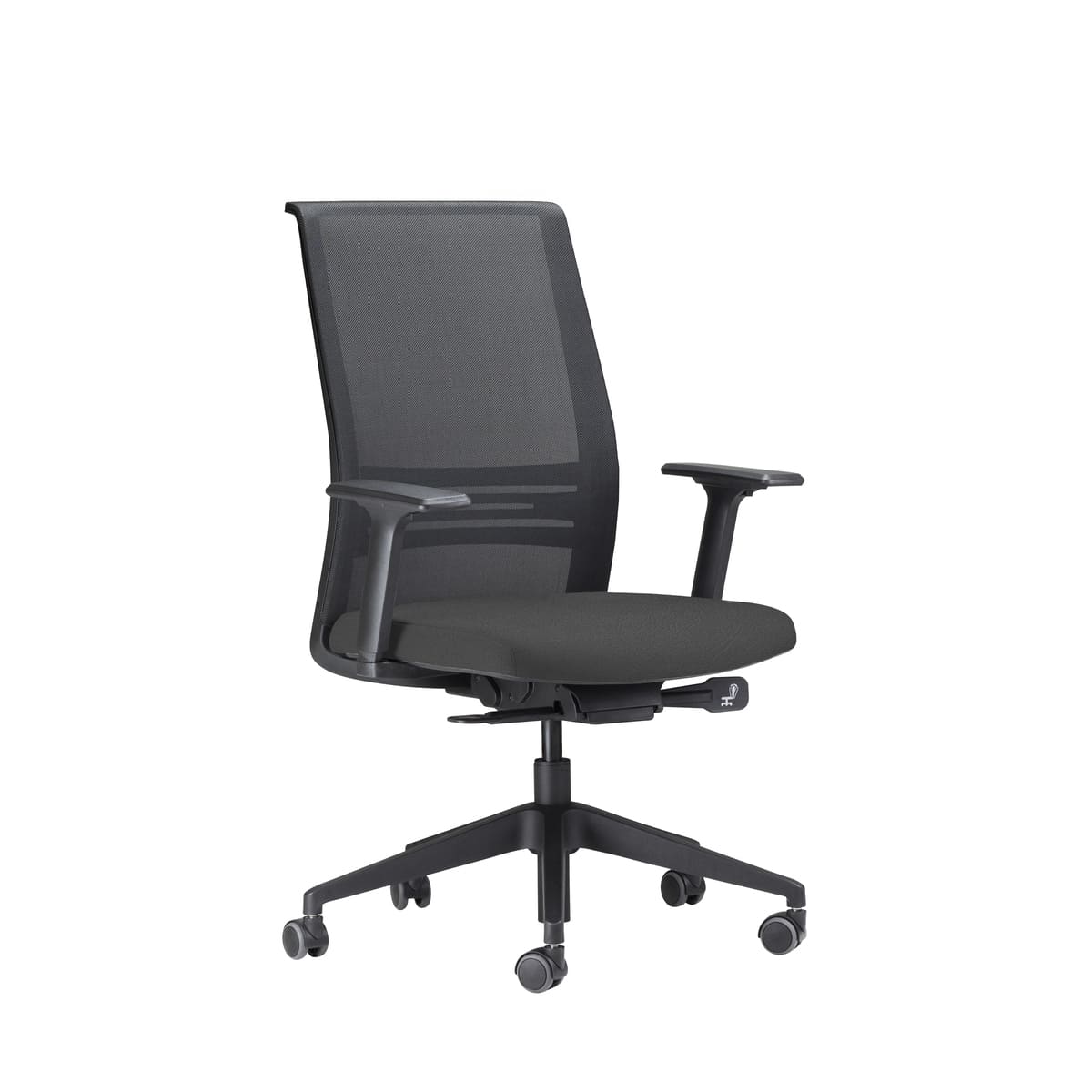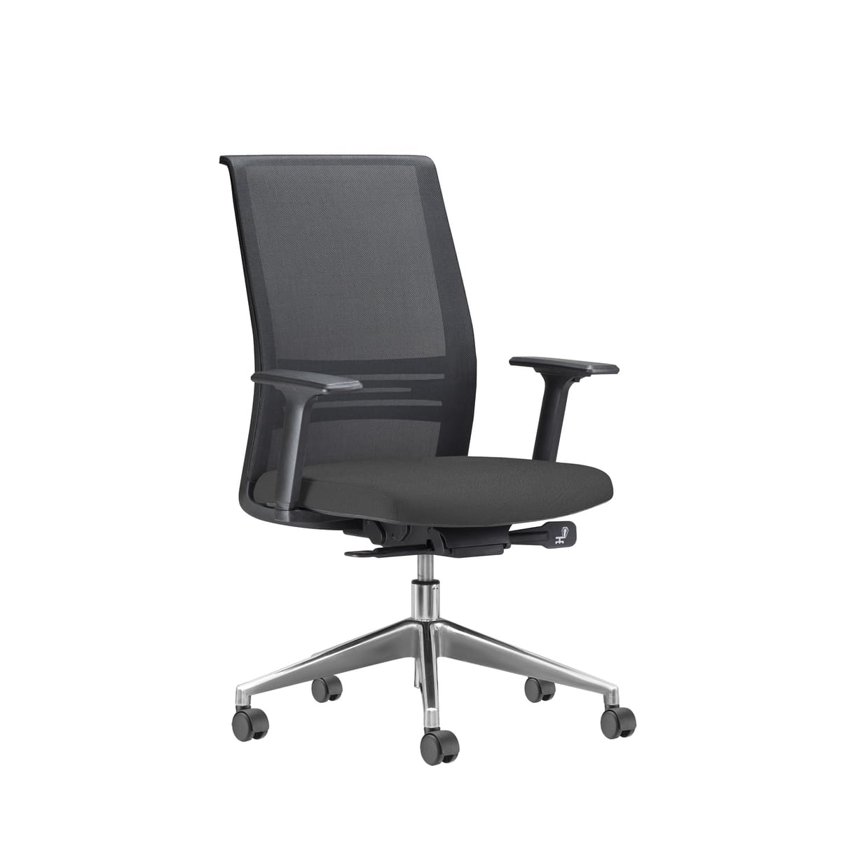 Mecanismo sincronizado, com movimento coordenado entre assento e encosto, travamento em até quatro posições e ajustes de altura e profundidade.