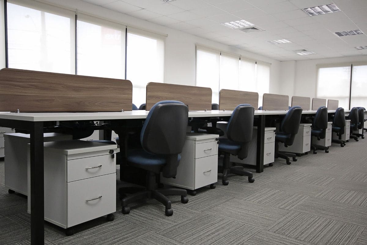 Estrutura metálica com capa e rodízios em nylon, indicados para piso carpete.