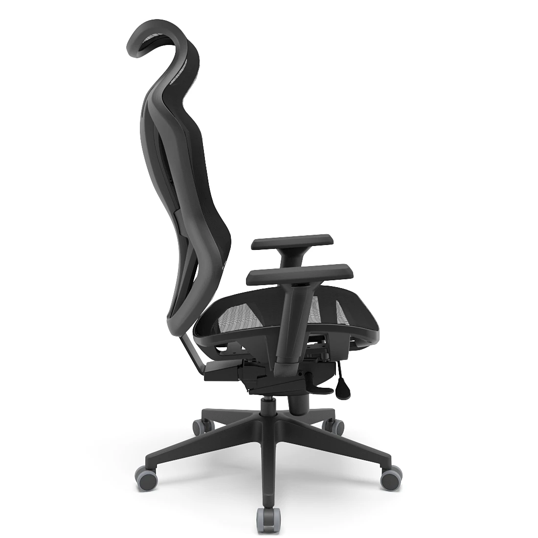 Os mecanismos RelaxSystem ou Sincron permitem ajuste sincronizado entre encosto e assento, oferecendo controle preciso da inclinação. Os braços 3D Shift ampliam as possibilidades de regulagem, permitindo adaptação personalizada para diferentes biotipos e rotinas.