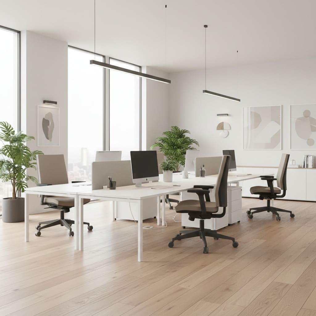 A regulagem de altura do encosto e o assento estofado com espuma de densidade adequada contribuem para conforto contínuo, sem comprometer a organização visual do ambiente corporativo.