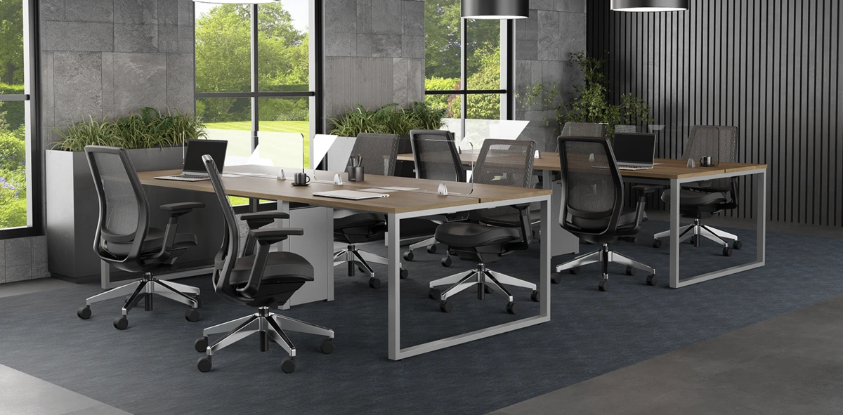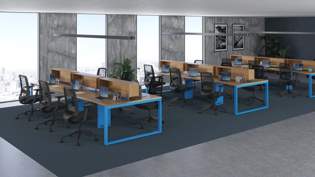 A Estação de trabalho | Pé Requadro foi desenvolvida para compor escritórios operacionais e áreas de trabalho coletivo que demandam organização visual e coerência no layout. O desenho da base metálica em formato fechado contribui para uma leitura mais uniforme do ambiente, favorecendo projetos de maior escala.