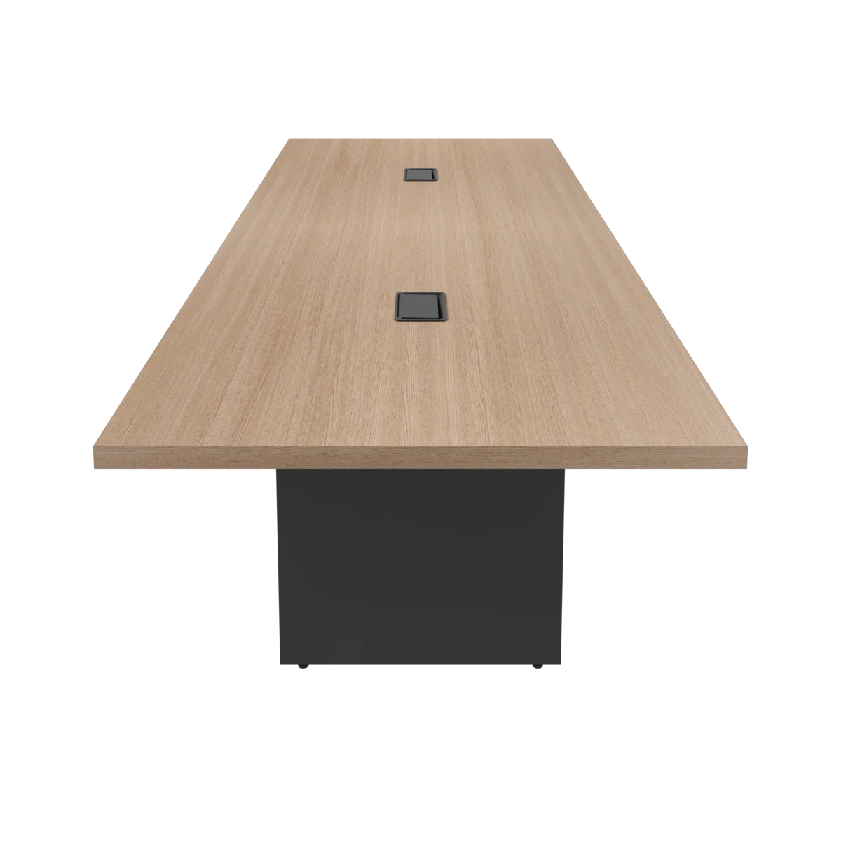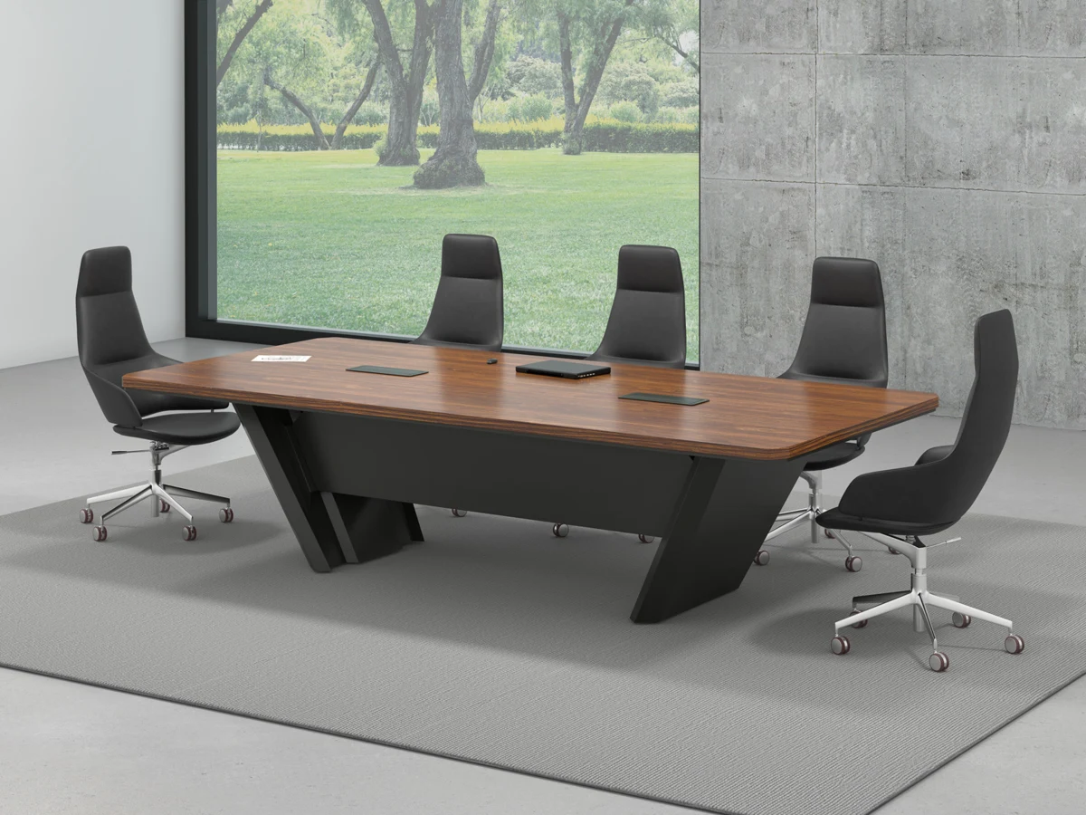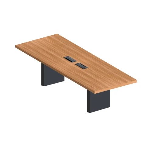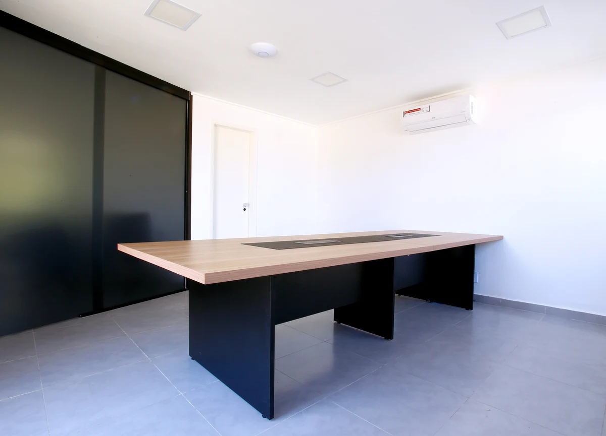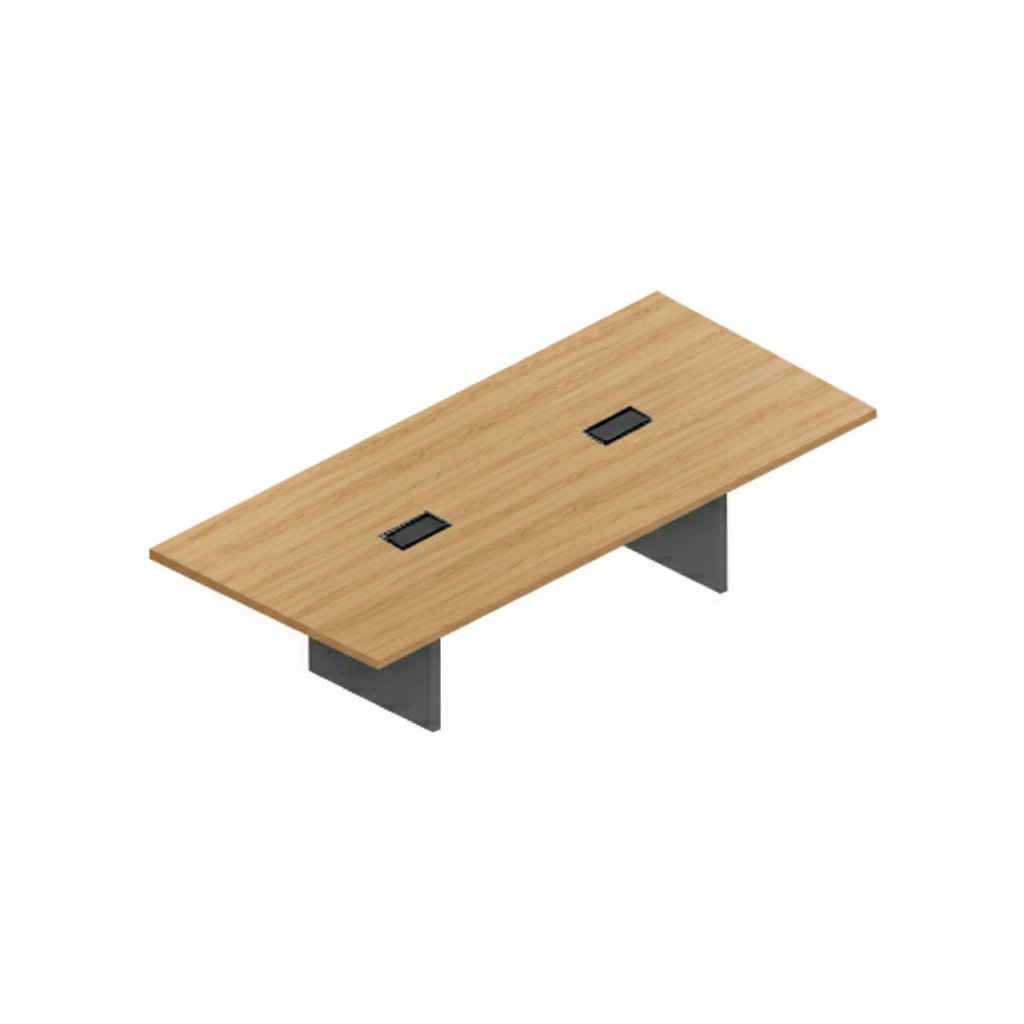 Mesa de reunião com base estrutural em painel, indicada para ambientes executivos, salas estratégicas e espaços colaborativos formais.