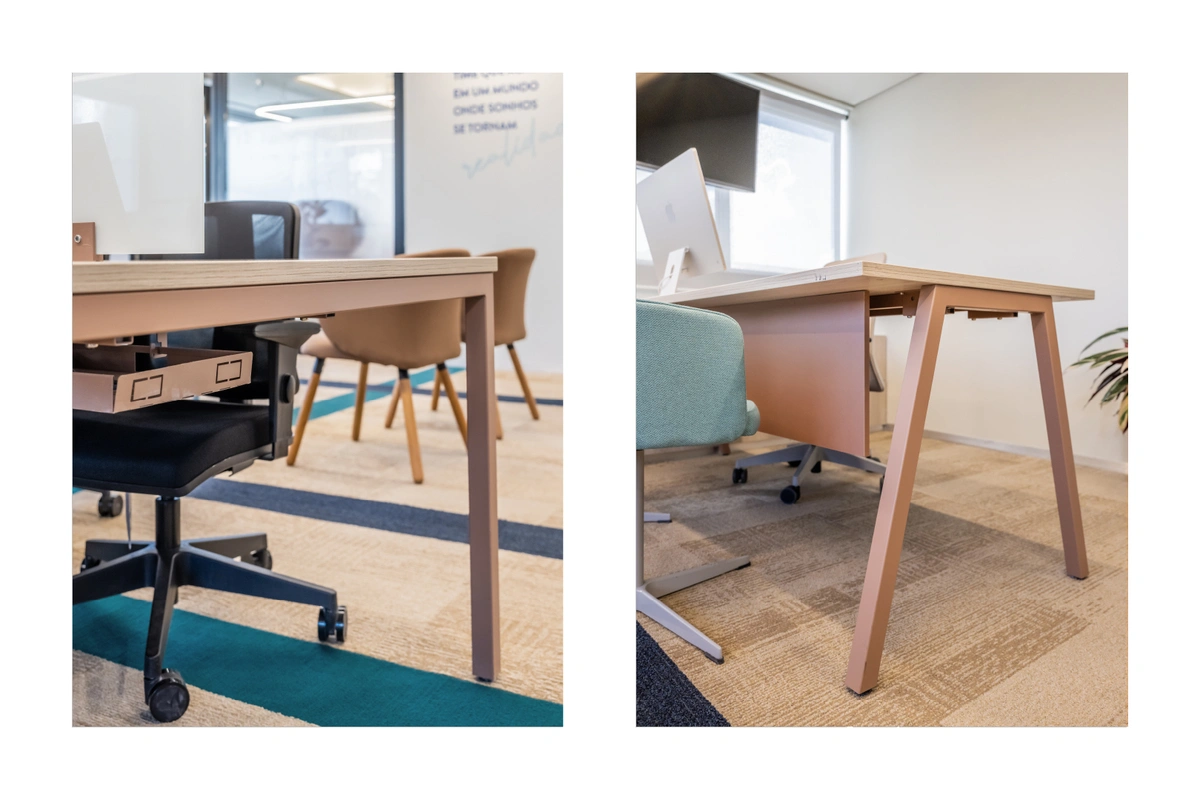 Além da funcionalidade, o modelo permite personalização de acabamentos e composição de cores entre tampo e estrutura metálica, possibilitando integração ao projeto arquitetônico e à identidade visual do escritório.