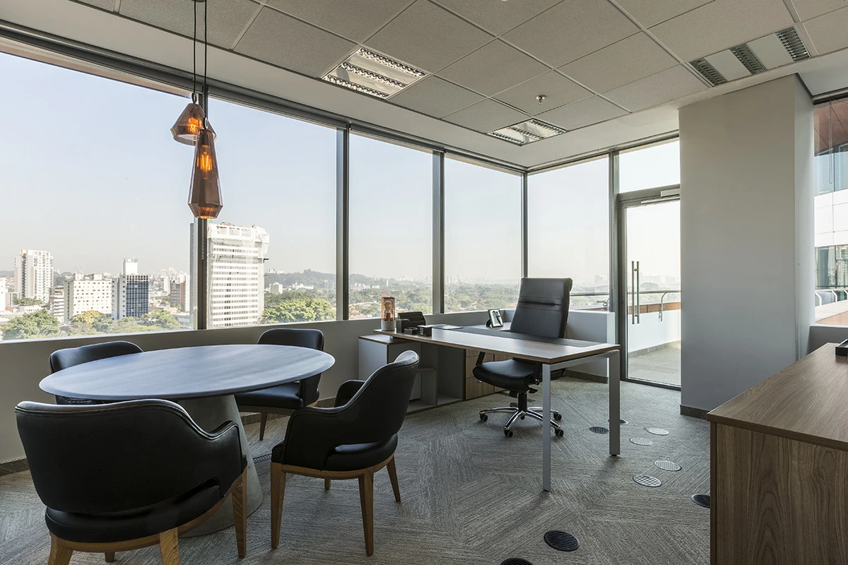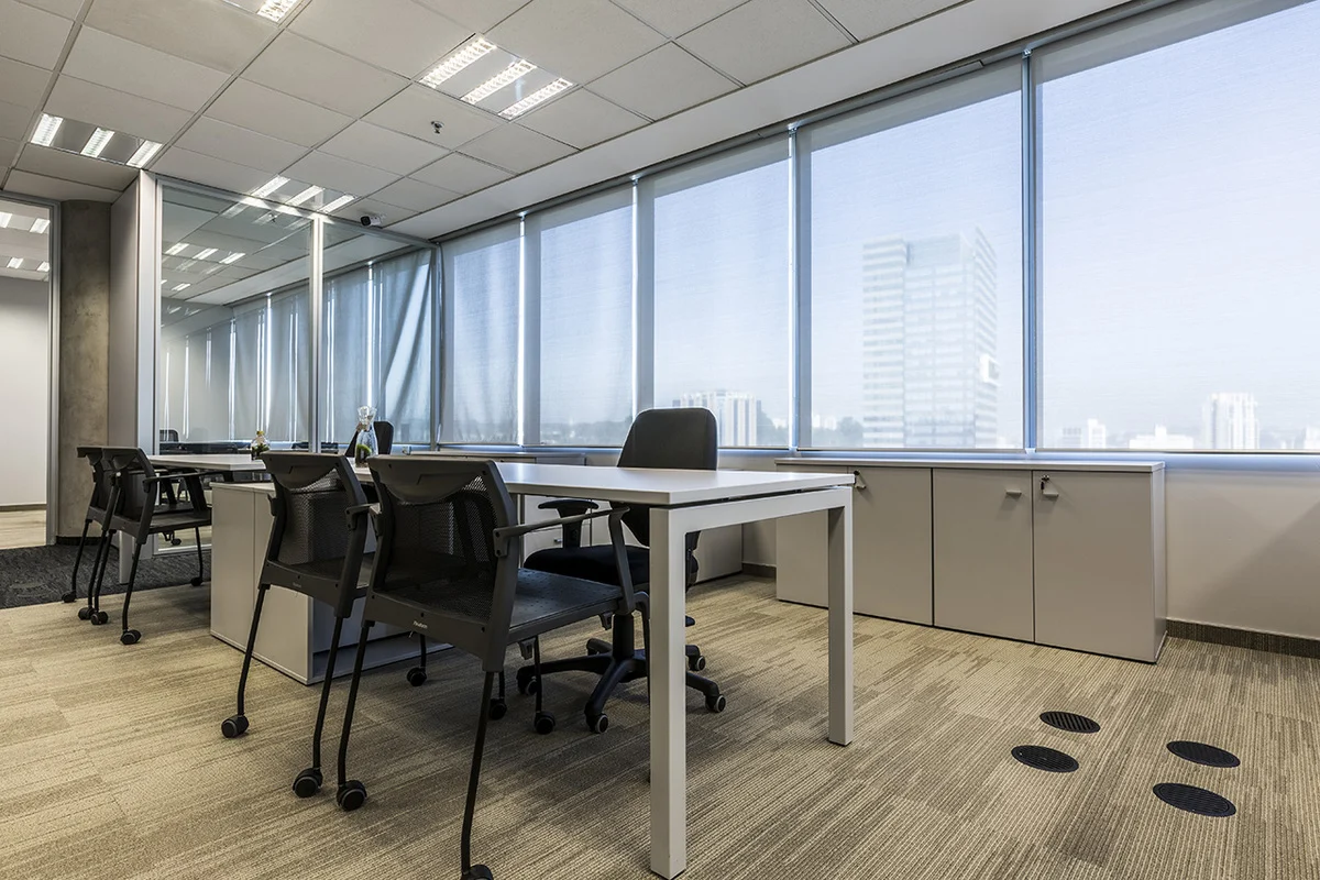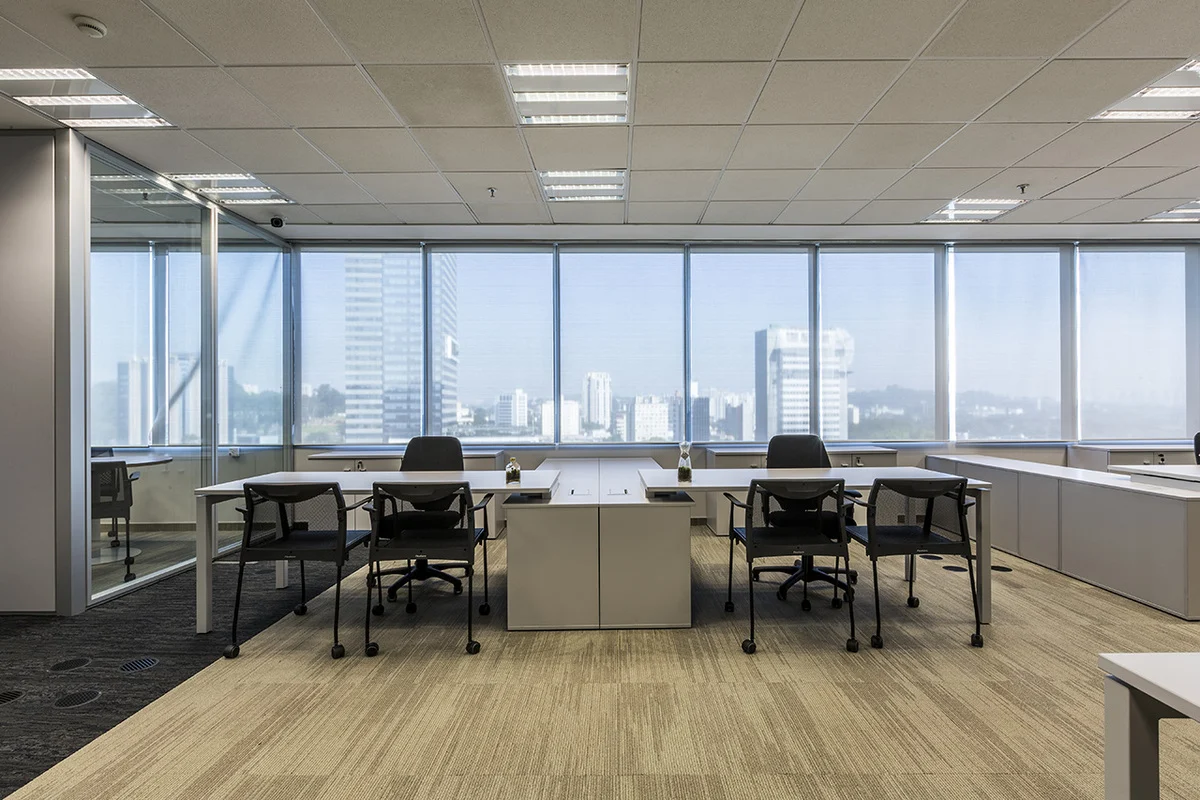 O tampo amplo permite acomodação confortável de equipamentos, documentos e acessórios de trabalho. A possibilidade de integrar caixa de tomadas e passagem de cabos mantém a superfície limpa e organizada, mesmo em rotinas intensas.