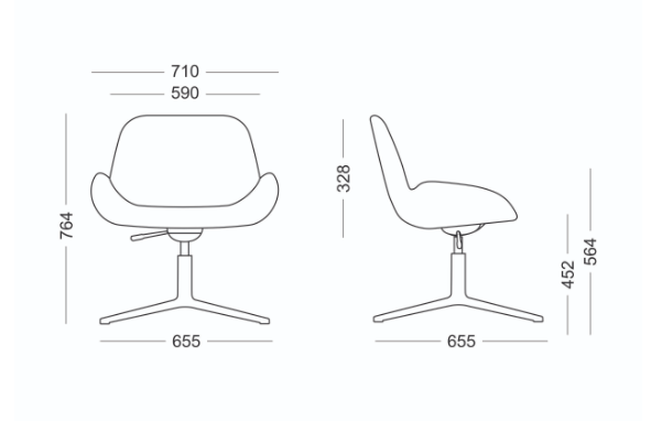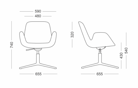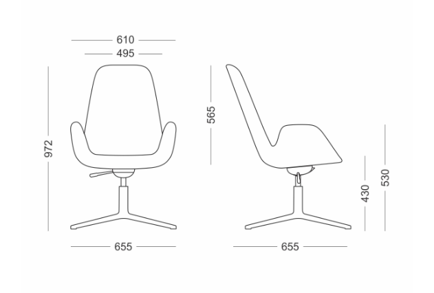 Encosto alto - Alt: 972; Larg: 655; Prof: 655; Encosto baixo - Alt: 740; Larg: 655; Prof: 655; Encosto baixo Plus - Alt: 764; Larg: 710; Prof: 655.