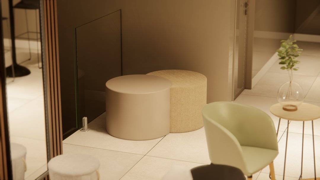 A presença do puff contribui para criar pontos de apoio e descanso, sem comprometer a circulação ou a composição visual do ambiente corporativo.