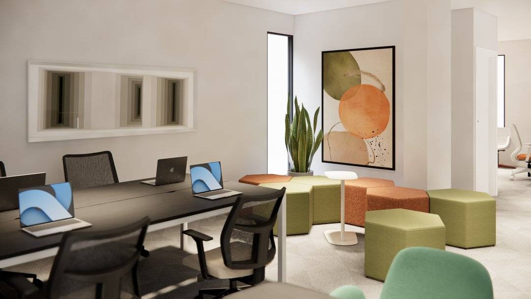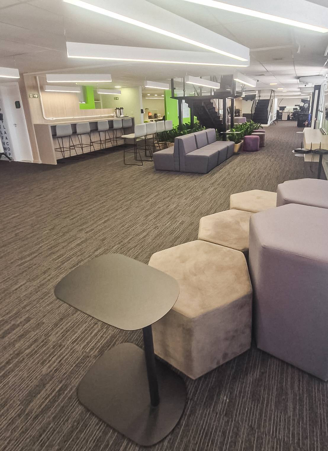Ambientes corporativos contemporâneos, áreas colaborativas, lounges, salas de descompressão e ambientes educacionais.