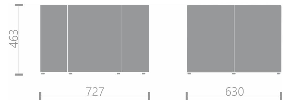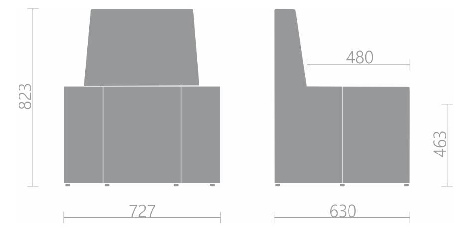 Hexagonal: Altura: 463; Largura: 727; Profundidade: 630; Com encosto: Altura: 823; Largura: 727; Profundidade: 630