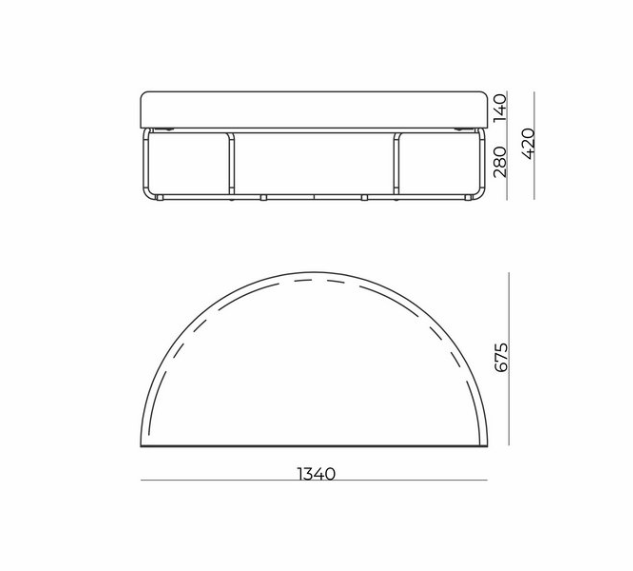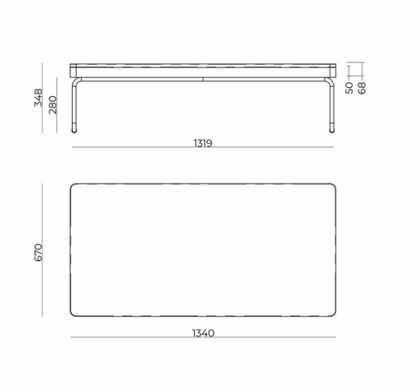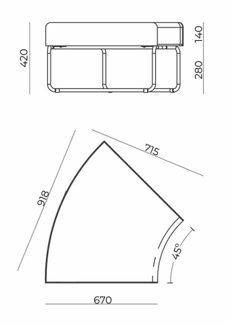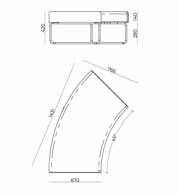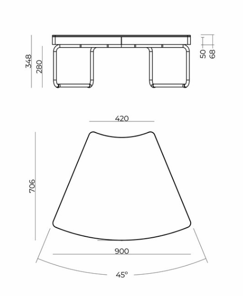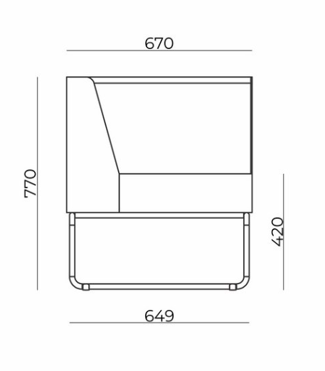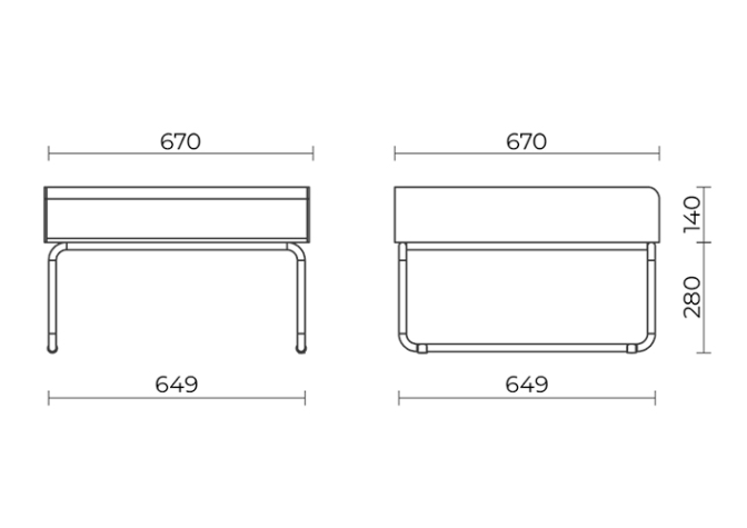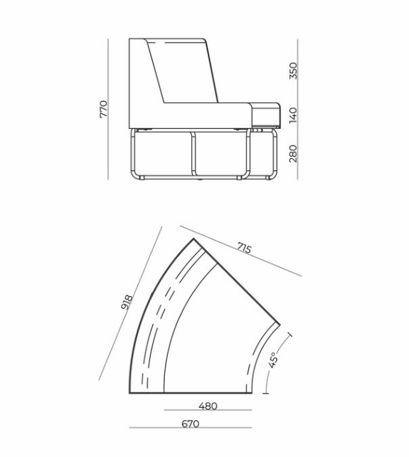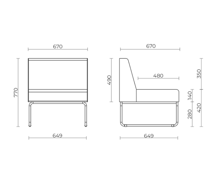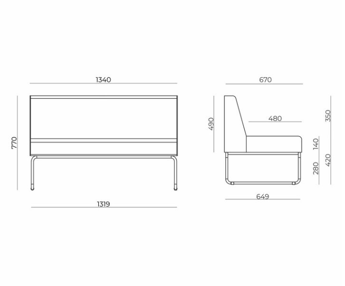 O módulo de um lugar possui largura total de 770 mm e o módulo de dois lugares possui largura total de 1500 mm, ambos com altura total de 770 mm.