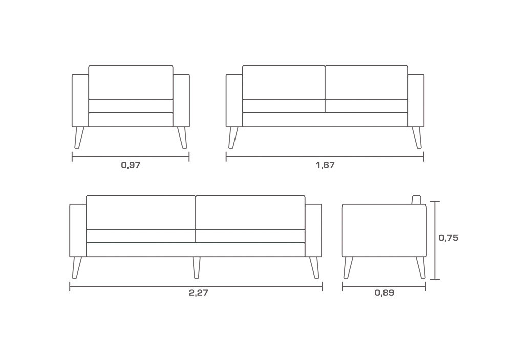 Larguras disponíveis: 0,97 | 1,67 | 2,27; Altura: 0,75; Profundidade: 0,89