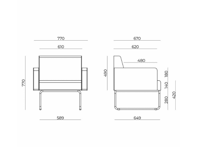 Estrutura trapezoidal produzida em tubo de aço carbono de seção redonda, com travessas estruturais do assento confeccionadas no mesmo material, garantindo resistência e estabilidade.